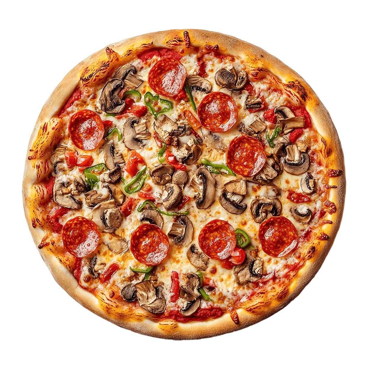 Tomate, fromage, champignons, poivrons, olives, tomates fraîches, huile d'olive, origan.