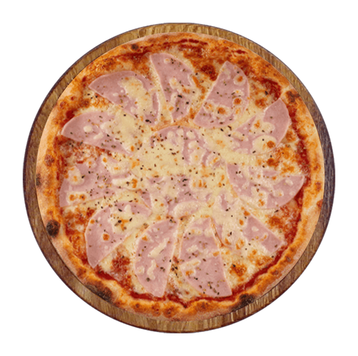 Tomate, fromage, jambon*, champignons, huile d'olive, origan.