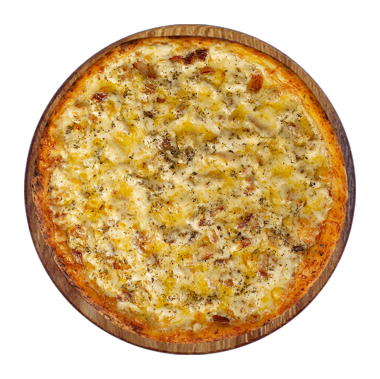 Crème fraîche, lardons, champignons, double fromage.